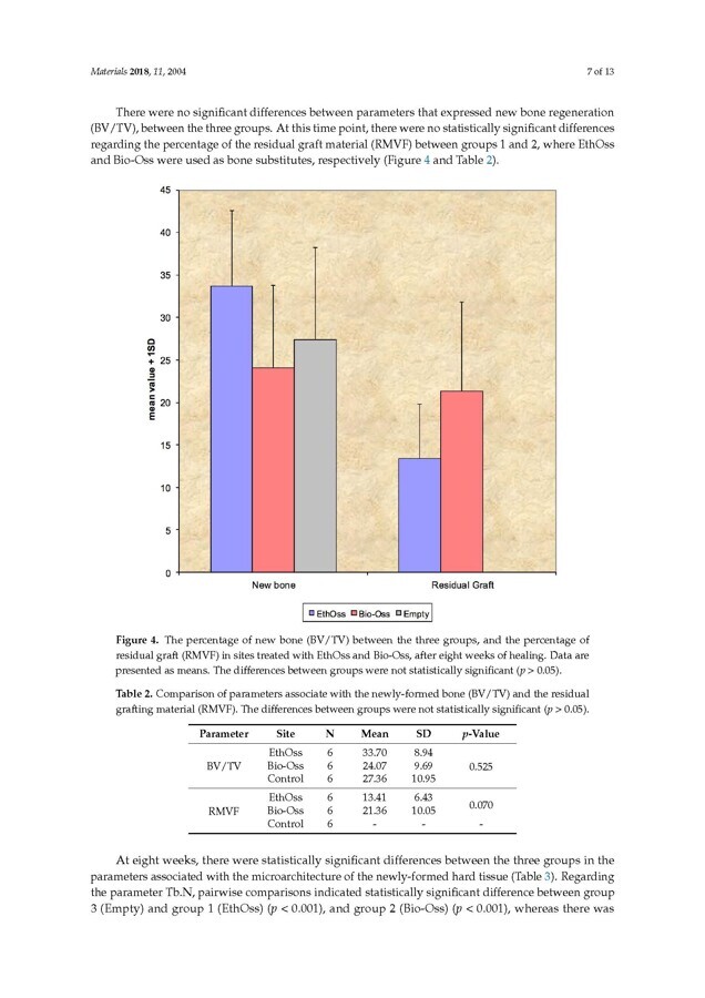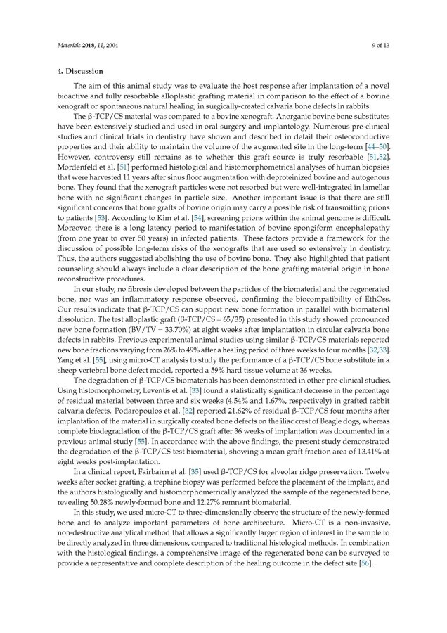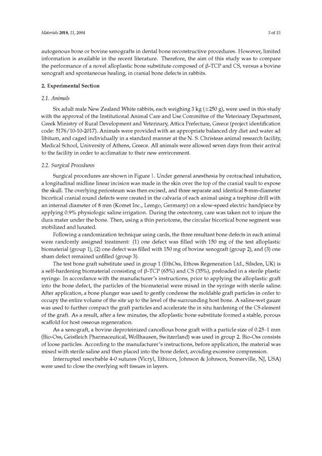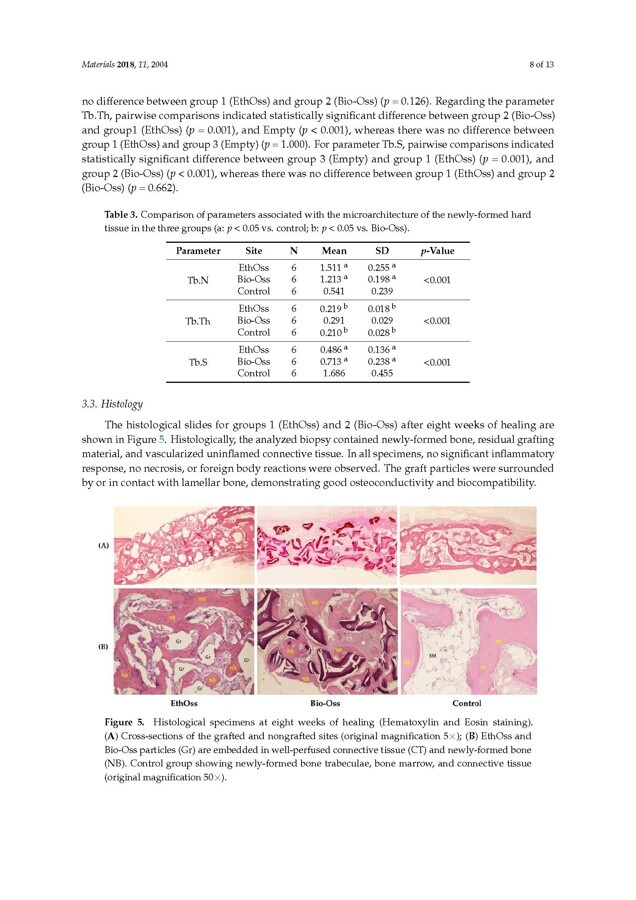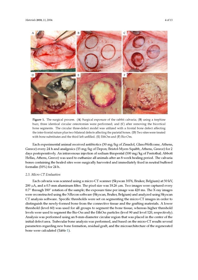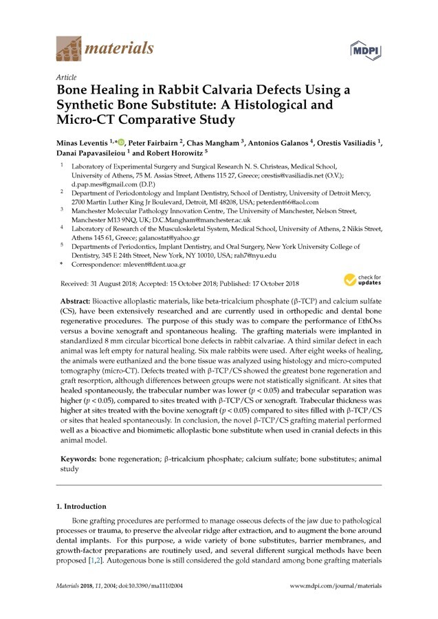 Bioactive alloplastic materials, like beta-tricalcium phosphate (β-TCP) and calcium sulfate (CS), have been extensively researched and are currently used in orthopedic and dental bone regenerative procedures. The purpose of this study was to compare the performance of EthOss versus a bovine xenograft and spontaneous healing. The grafting materials were implanted in standardized 8 mm circular bicortical bone defects in rabbit calvariae. A third similar defect in each animal was left empty for natural healing. Six male rabbits were used. After eight weeks of healing, the animals were euthanized and the bone tissue was analyzed using histology and micro-computed tomography (micro-CT). Defects treated with β-TCP/CS showed the greatest bone regeneration and graft resorption, although differences between groups were not statistically significant. At sites that healed spontaneously, the trabecular number was lower (p < 0.05) and trabecular separation was higher (p < 0.05), compared to sites treated with β-TCP/CS or xenograft. Trabecular thickness was higher at sites treated with the bovine xenograft (p < 0.05) compared to sites filled with β-TCP/CS or sites that healed spontaneously. In conclusion, the novel β-TCP/CS grafting material performed well as a bioactive and biomimetic alloplastic bone substitute when used in cranial defects in this animal model.