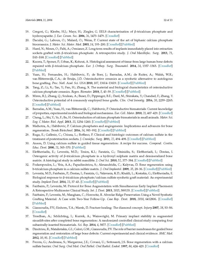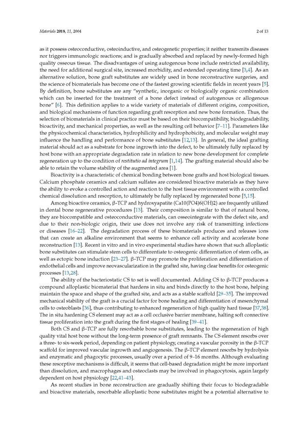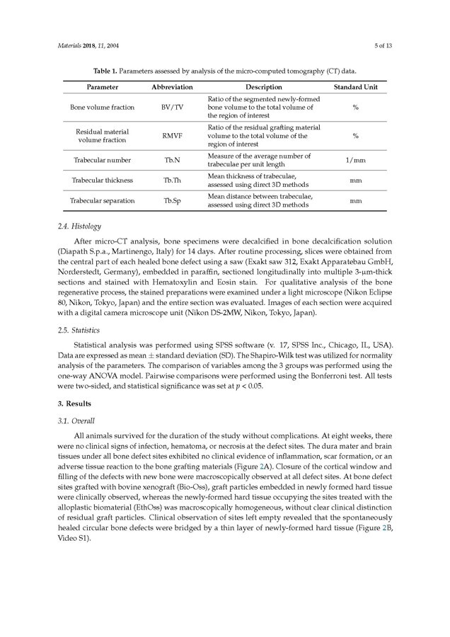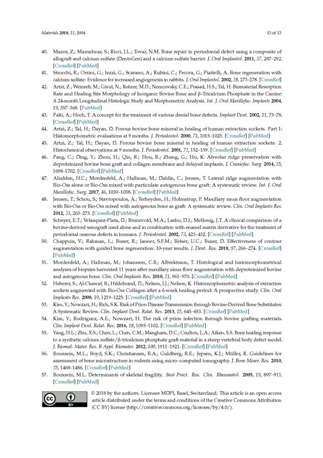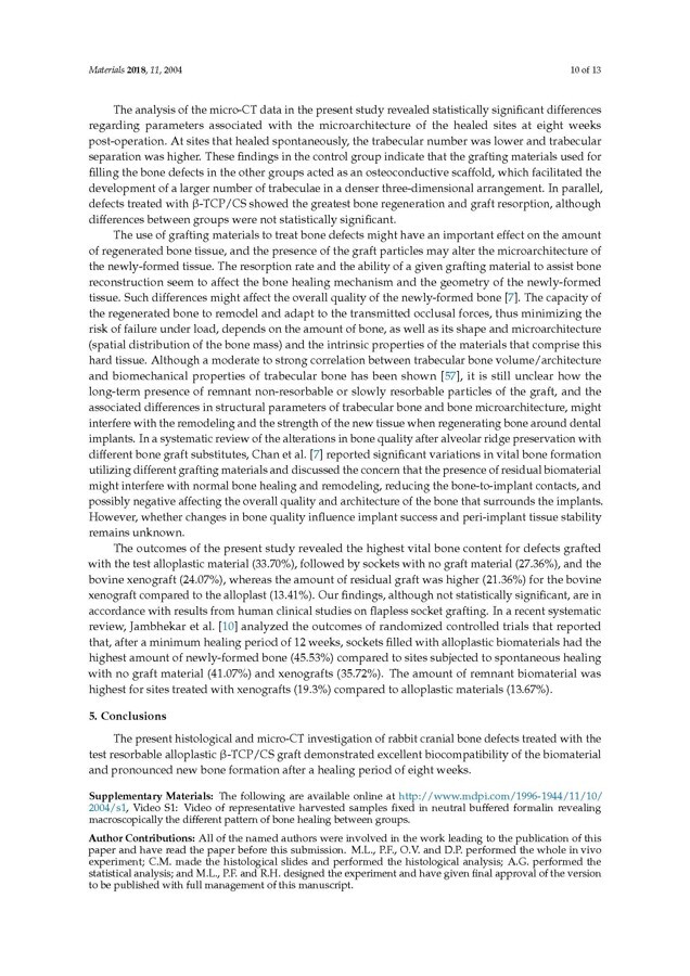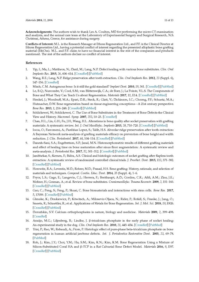 Bioactive alloplastic materials, like beta-tricalcium phosphate (β-TCP) and calcium sulfate (CS), have been extensively researched and are currently used in orthopedic and dental bone regenerative procedures. The purpose of this study was to compare the performance of EthOss versus a bovine xenograft and spontaneous healing. The grafting materials were implanted in standardized 8 mm circular bicortical bone defects in rabbit calvariae. A third similar defect in each animal was left empty for natural healing. Six male rabbits were used. After eight weeks of healing, the animals were euthanized and the bone tissue was analyzed using histology and micro-computed tomography (micro-CT). Defects treated with β-TCP/CS showed the greatest bone regeneration and graft resorption, although differences between groups were not statistically significant. At sites that healed spontaneously, the trabecular number was lower (p < 0.05) and trabecular separation was higher (p < 0.05), compared to sites treated with β-TCP/CS or xenograft. Trabecular thickness was higher at sites treated with the bovine xenograft (p < 0.05) compared to sites filled with β-TCP/CS or sites that healed spontaneously. In conclusion, the novel β-TCP/CS grafting material performed well as a bioactive and biomimetic alloplastic bone substitute when used in cranial defects in this animal model.