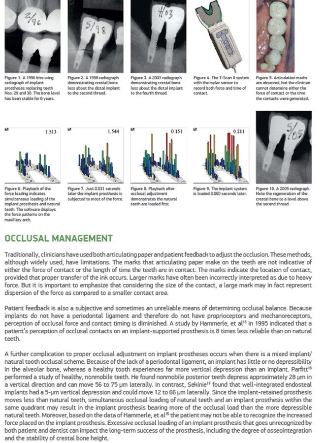 Many clinicians believe that occlusal forces placed on implants can have a deleterious effect on their long-term success. In addition to microbiological factors, excessive occlusal loading of dental implants has been implicated in the failure of both materials and implant osseointegration.1,2 However, controversy exists as to the role of occlusion in the loss of bone following placement of an implant prosthesis.3