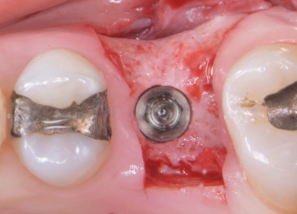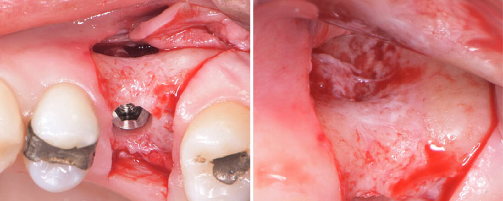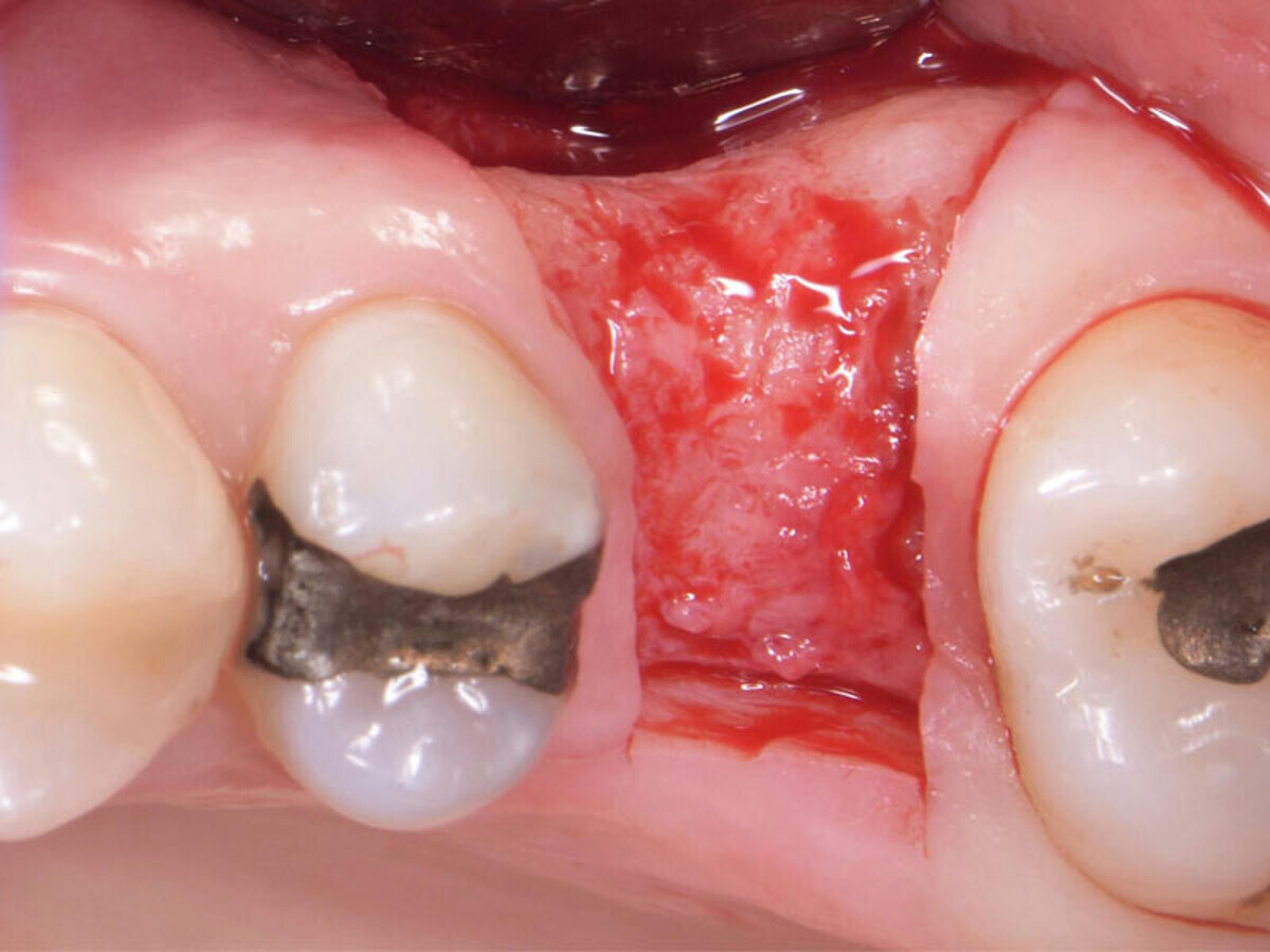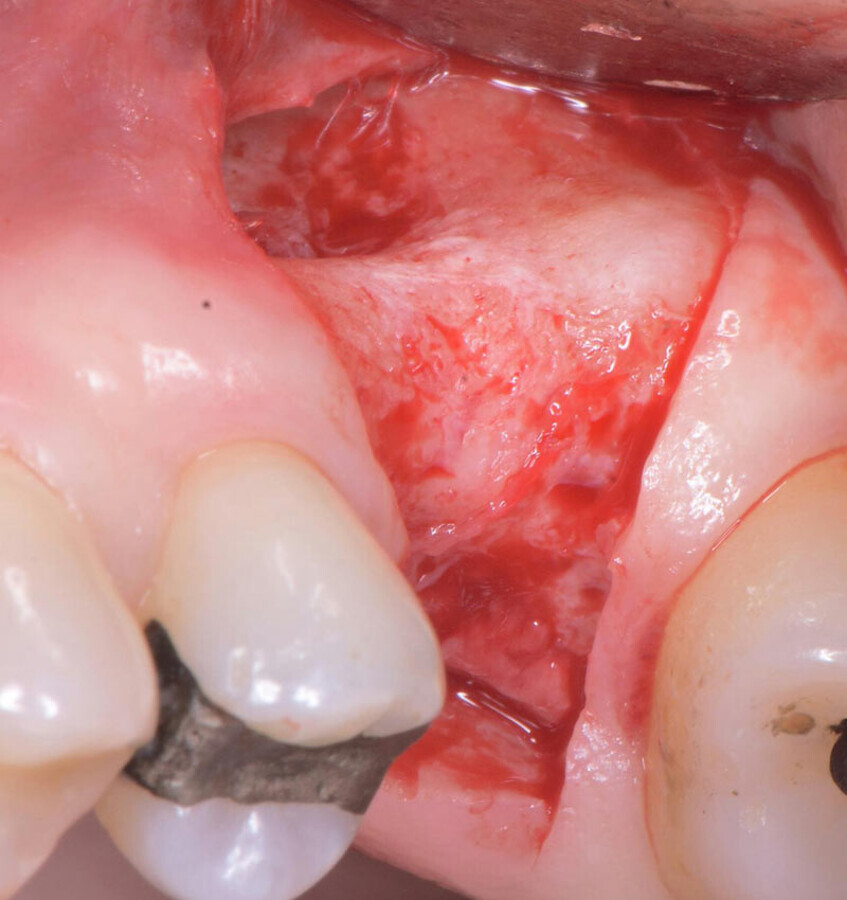 EthOss grafting in fully guided implant placement case with Paltop Guided Implant System. Female 51-year-old patient, non-smoker, non-contributory medical history. Extraction of fractured and infected 26 carried out 10 months ago. Digital planning showed possible buccal defect, so flap raised and grafting was necessary.