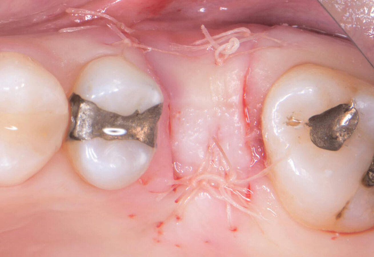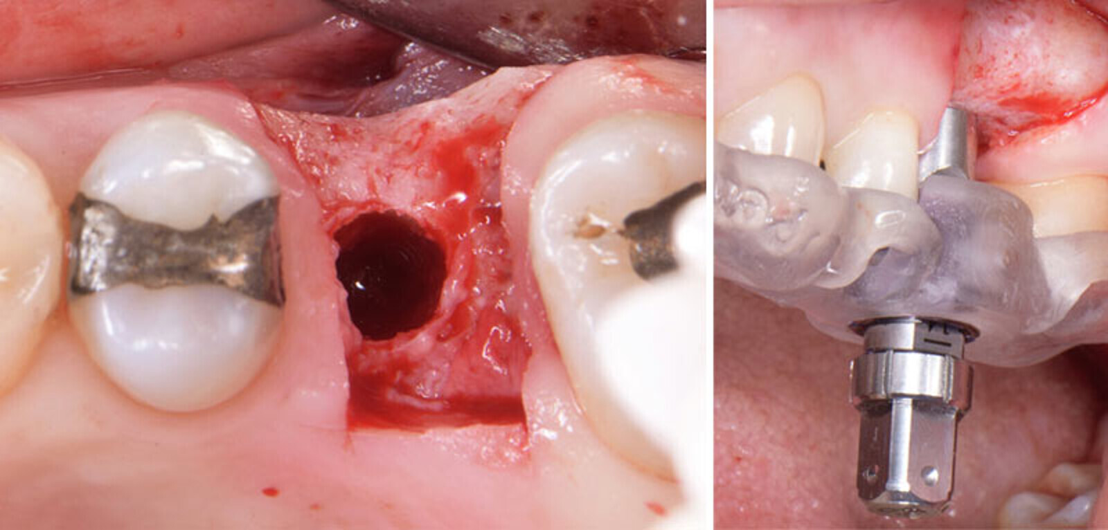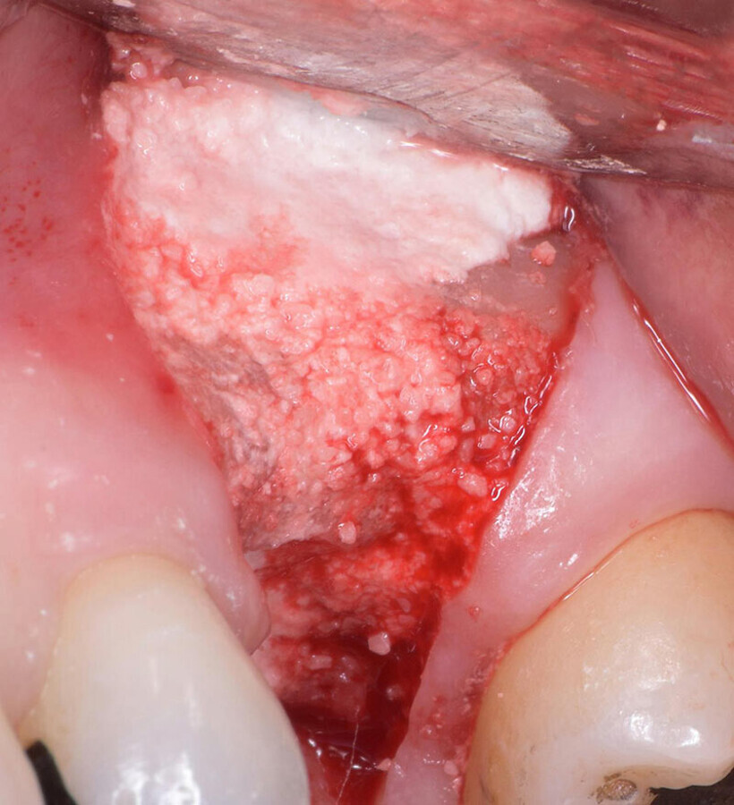 EthOss grafting in fully guided implant placement case with Paltop Guided Implant System. Female 51-year-old patient, non-smoker, non-contributory medical history. Extraction of fractured and infected 26 carried out 10 months ago. Digital planning showed possible buccal defect, so flap raised and grafting was necessary.