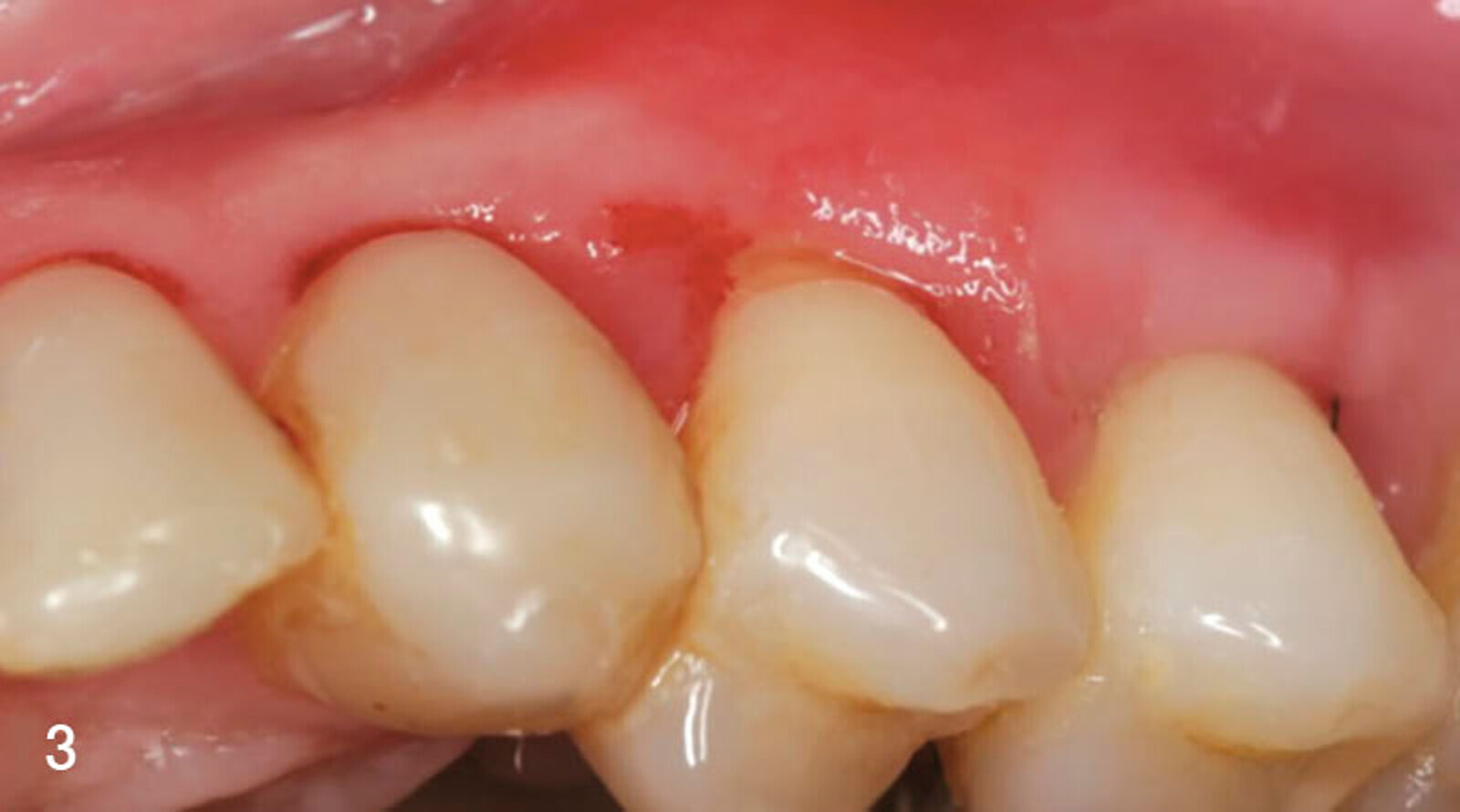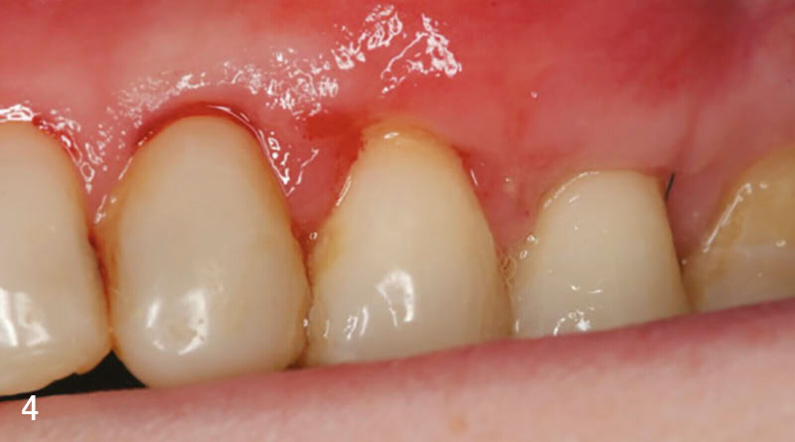 Excellent healing was seen at the 4 week follow-up; however, some OrACELL was protruding from free gingival region in area between #12 and #13 (Figs 3-4).