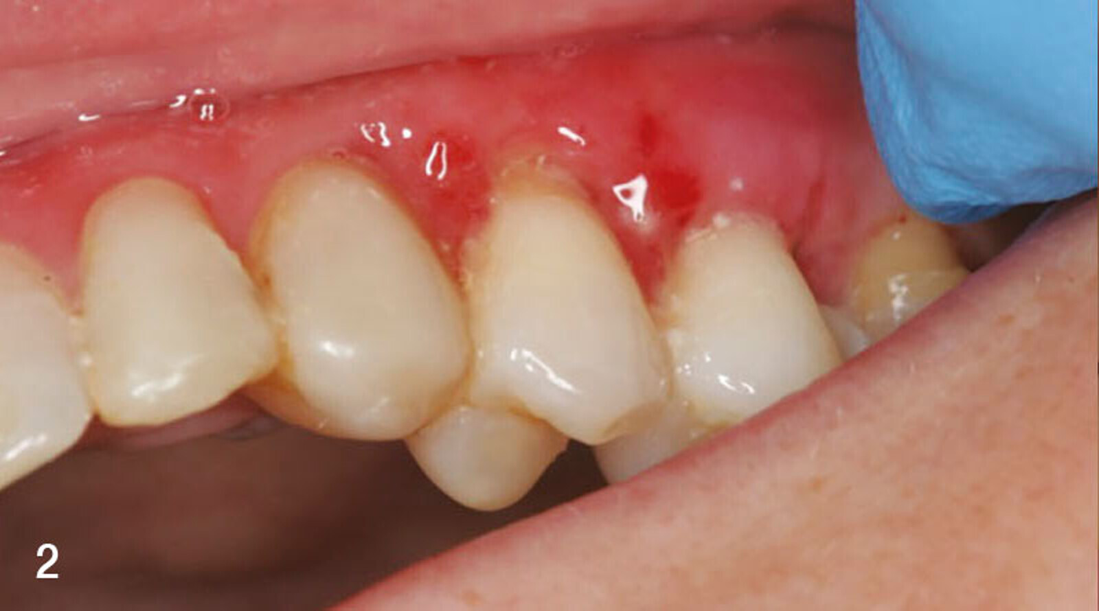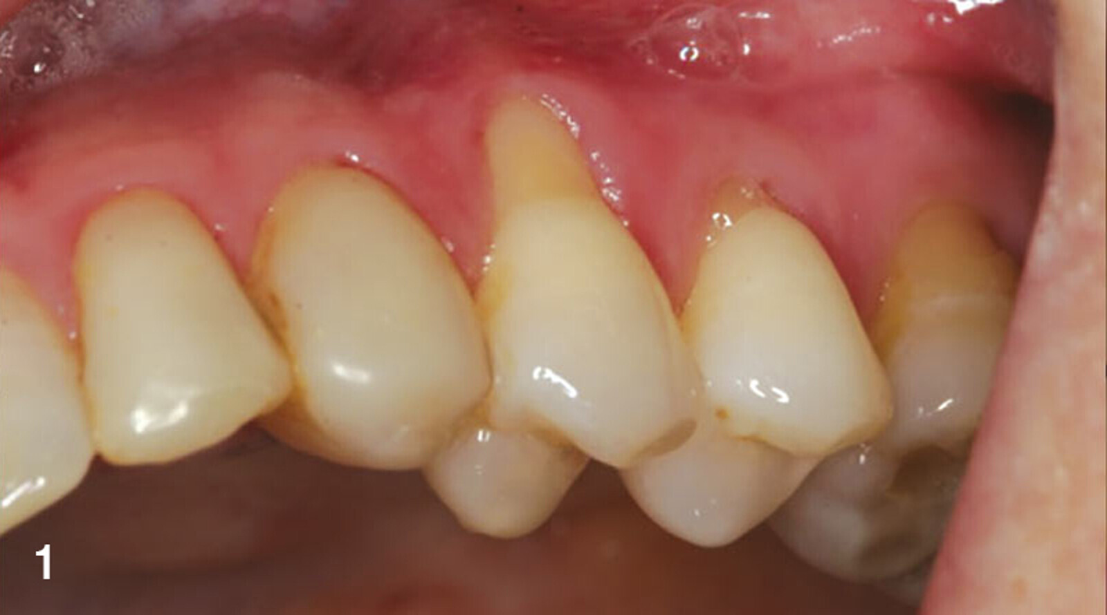 In this case, a patient with severe gum recession was treated with soft tissue allograft. Gum recession was seen in the upper left first bicuspid, and adjacent areas not needing immediate attention. (Fig 1).