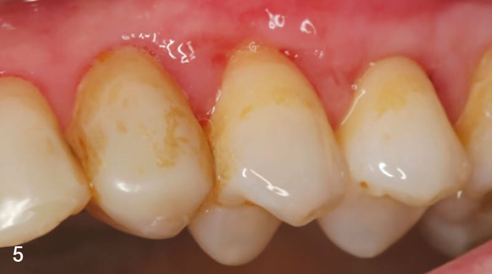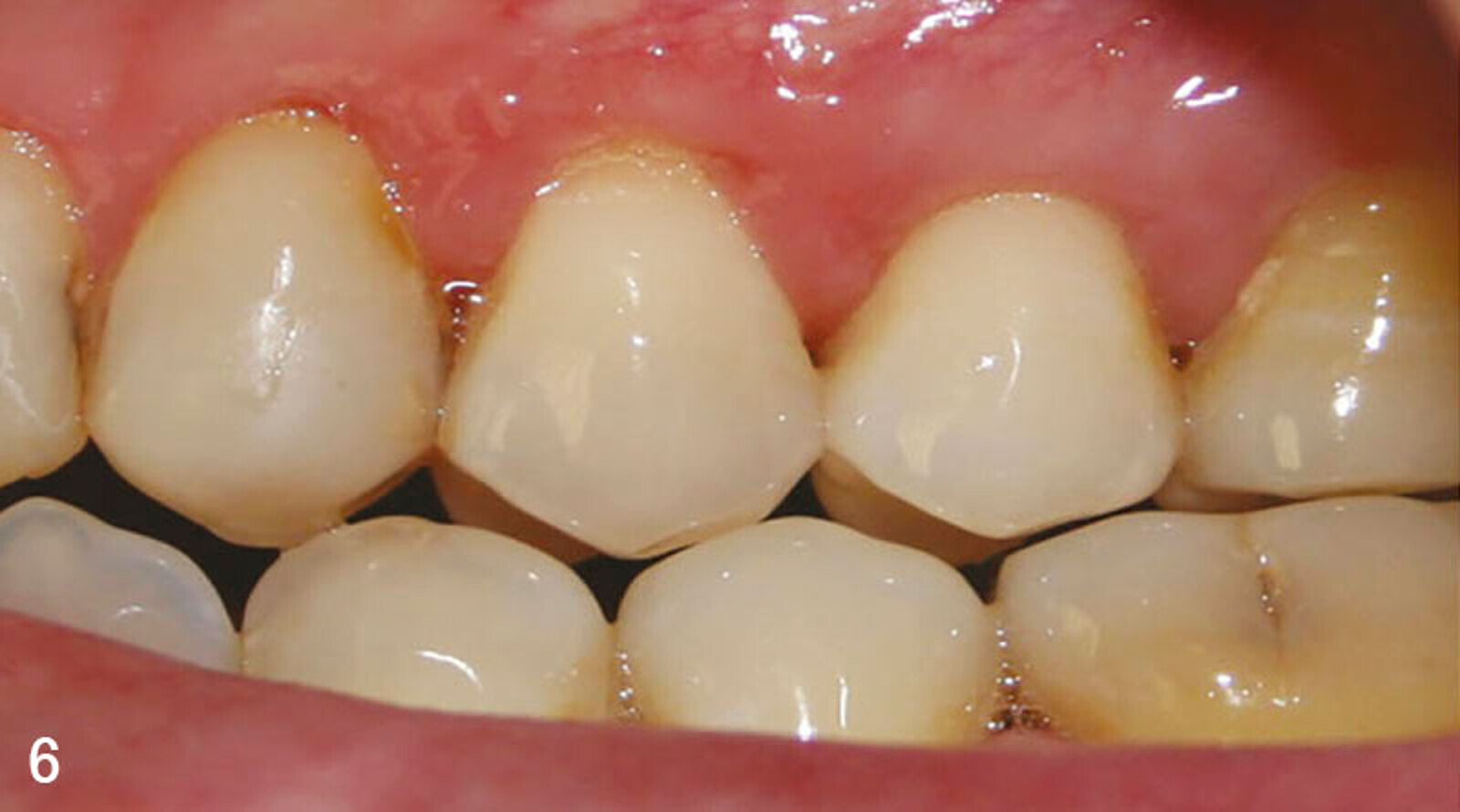 Step one of treatment was for the patient to alter brushing technique to eliminate mechanical trauma. The next phase was surgical, including local anesthesia with aggressive cleaning of the roots of teeth 20, 21, and 22, followed by tetracycline application. Incisions were made on the facial aspect of #s 12, and 13, extending mesially and distally on the buccal side at the base of the papillae. Partial thickness dissection carried into the vestibule for necessary extension thus releasing the muscle pull on #12. OrACELL was sutured over the facial surface, and the buccal flap was sutured over the graft. A periodontal dressing was used to protect the graft. Most of sutures removed at 2 weeks; however some remained functional and were left (Fig 2)