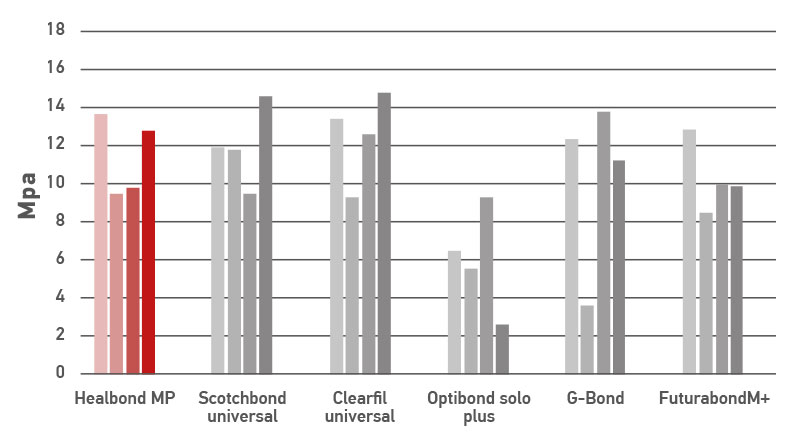 * Τα τεστ διεξάχθηκαν από την G-Pharma. ∆ύναµη διάτµισης δεσµού (Shear bond strength): τεστ που διεξάχθηκαν ακολουθώντας το ISO 11405 norm. Βαθµός µετατροπής κατά τον πολυµερισµό: ο βαθµός µετατροπής αξιολογήθηκε µε τη χρήση φασµατόµετρου FTIR µε εξάρτηµα αποσβένουσας ολικής ανάκλασης (attenuated total reflectance ATR accessory). O πολυµερισµός διεξάχθηκε µε πολυµεριστικό της Elsodent: 9mm διάµετρο και ισχύος 600mW/cm2 σε θερµοκρασία δωµατίου (20 βαθµούς Κελσίου).
