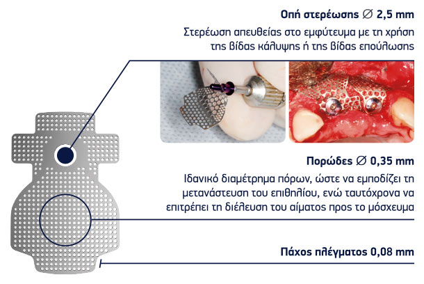 Τροποποιήσιµο, τρισδιάστατο και διάτρητο πλέγµα τιτανίου για GBR, για τη διατήρηση χώρου και σταθερότητας του µοσχεύµατος.