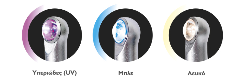 - Ο φακός αποτελείται από mini LED (που παράγει φως υπεριώδες + μπλε + λευκό) που μπορεί να συνδυαστεί ή να χρησιμοποιηθεί το καθένα ξεχωριστά.