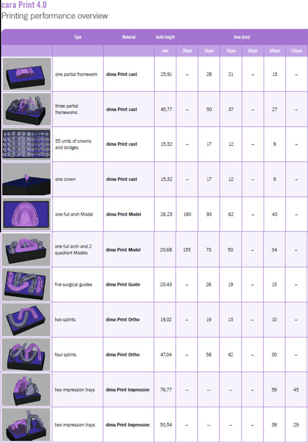 – 17 λεπτά για εκτύπωση 55 στεφανών στα 50μm, 19 λεπτά για εκτύπωση 5 χειρουργικών ναρθηκών σε 70μm, 30 λεπτά για εκτύπωση 4 ναρθηκών στα 100μm, 50 λεπτά για εκτύπωση 4 σκελετών μερικών οδοντοστοιχιών ακρίβειας 50μm, 62 λεπτά για εκτύπωση εκμαγείου πλήρους τόξου άνω γνάθου στα 70μm, κ.α. (δείτε συνημμένο πίνακα)