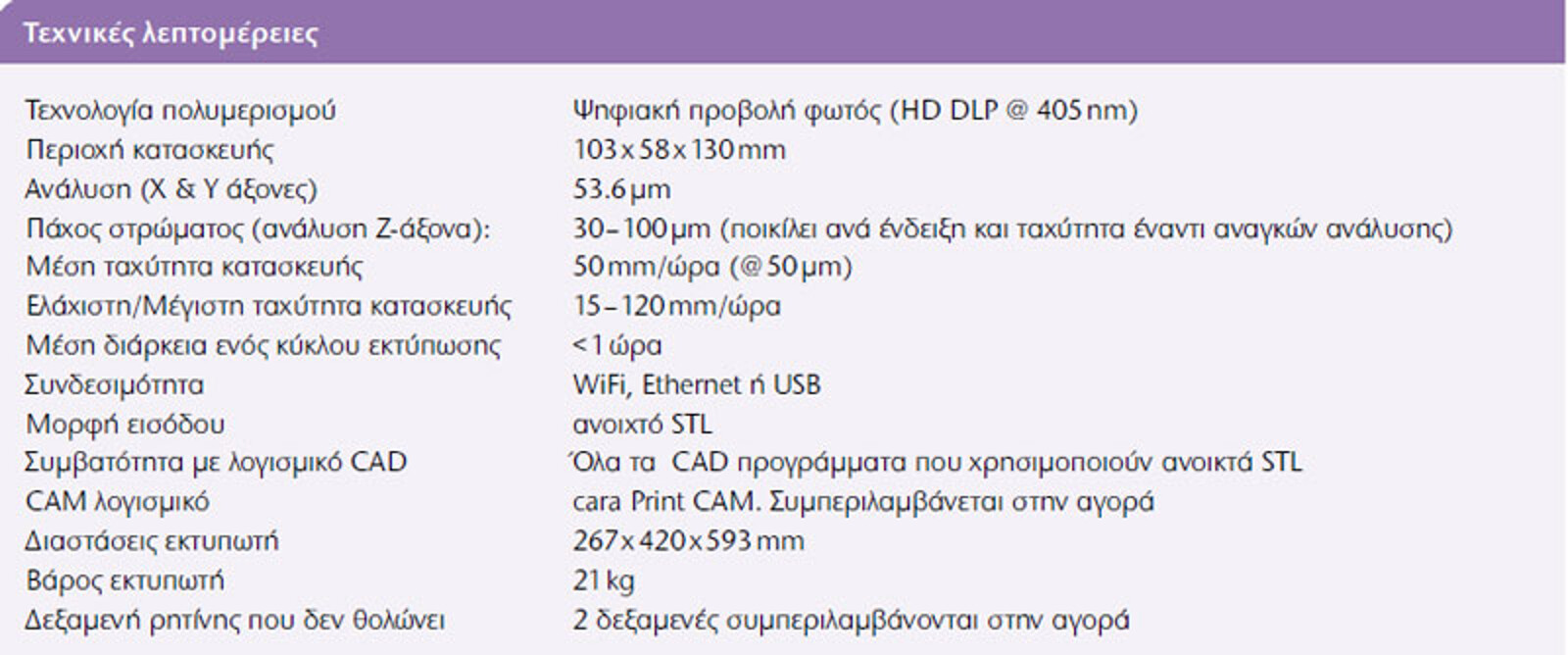 Ο Cara Print 4.0 με την τεχνολογία DLP, παράγει μονοχρωματικές αποκαταστάσεις, στρώμα προς στρώμα, χρησιμοποιώντας υψηλής ποιότητας φωτοπολυμερή.
